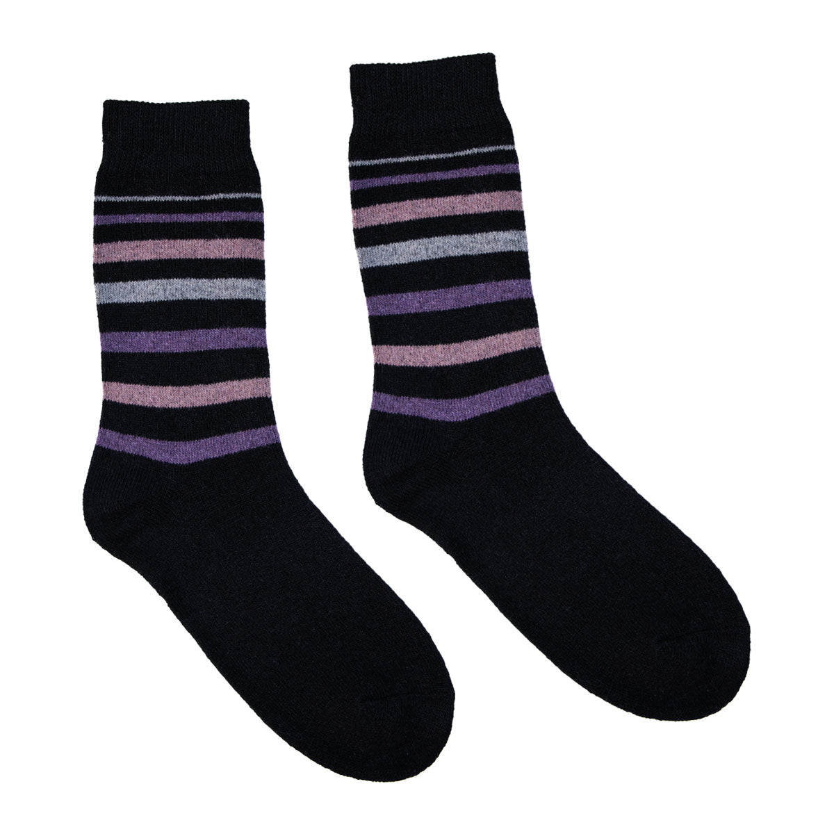 Izdelane so iz skrbno izbranega volnenega pletiva, ki odlično uravnava toploto, hkrati pa zagotavlja nežnost, elastičnost in vzdržljivost. Črtasti vzorec v odtenkih črne, vijolične, roza in sive dodaja subtilen kontrast, ki lepo dopolni zimsko garderobo – od domačega udobja do vsakodnevnih kombinacij za v službo.