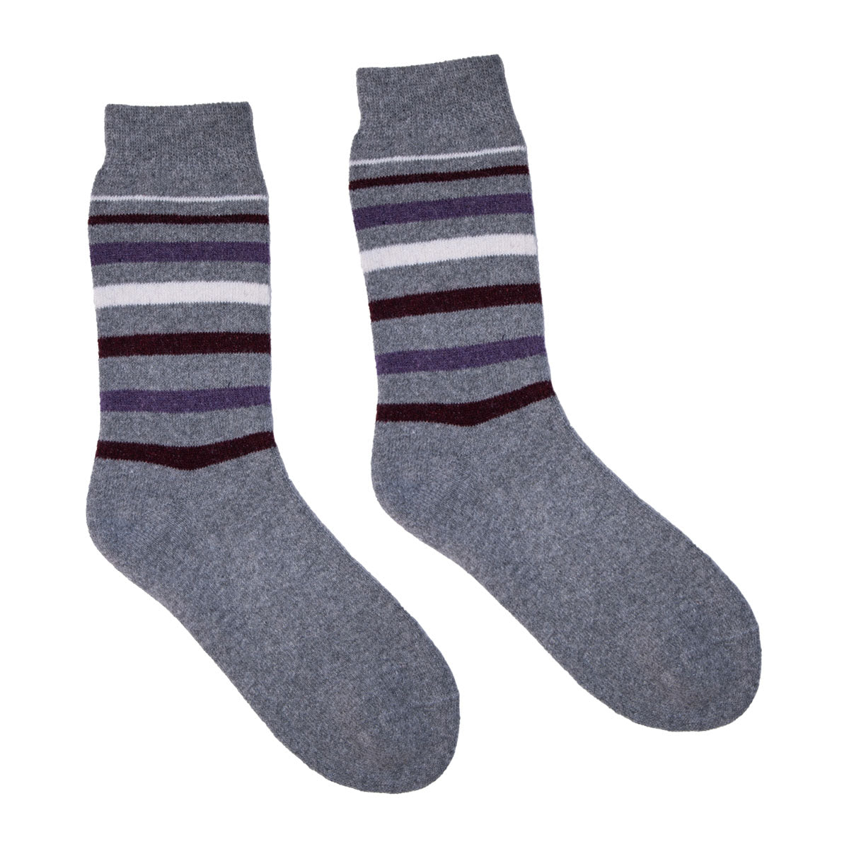 Izdelane so iz skrbno izbranega volnenega pletiva, ki odlično uravnava toploto, hkrati pa zagotavlja nežnost, elastičnost in vzdržljivost. Črtasti vzorec v odtenkih svetlo sive, temno sive, bele, vijolične in bordo doda prijeten kontrast, ki brezčasno dopolni jesensko-zimske kombinacije – od topline doma do sproščenih dnevnih kombinacij.