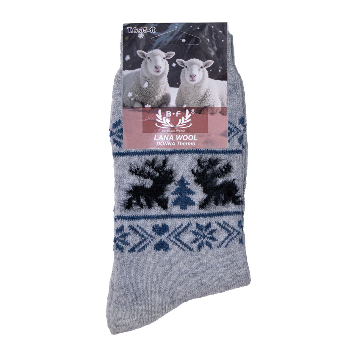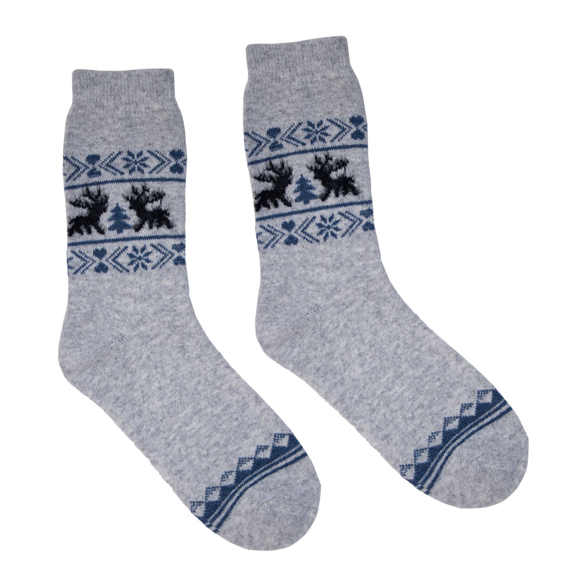Izdelane so iz skrbno izbranega volnenega pletiva, ki odlično uravnava toploto, hkrati pa zagotavlja nežnost, elastičnost in vzdržljivost. Nordijski vzorec v kombinaciji mehke sive podlage ter temno modrih in črnih detajlov (jelenčki, snežinke, drevesca) daje nogavicam pravi zimski karakter – popolne so tako za domače udobje kot za vsakodnevne zimske kombinacije.